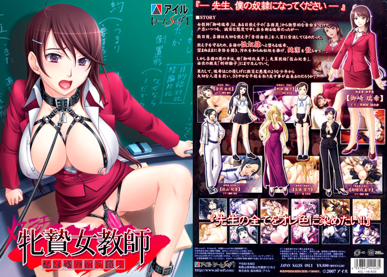 結婚を間近に控えた女教師・御崎瑞希は、教え子である各務晃から衝撃的な告白を受ける。「先生、僕の奴●になってください」そんな告白にも誠実に断る瑞希だったが、数日後、各務はある女生徒とのセックス映像を彼女に見せた。そこには瑞希を慕う女生徒・音羽由衣の姿が―。由衣を巧みに籠絡し、肉体関係を結んだ各務は、この先に待つ淫靡な調教を示唆しながら「由衣がこの後どうなるかは、先生の返答次第」と脅迫してきたのだ。各務の卑劣な手段に愕然としながらも、生徒を守るため、選択の余地などない瑞希は、望まぬままに身体を開かれ、汚されたことのなかった秘部を貫かれ、処女を散らされて…。こうして瑞希の、屈辱と快楽に翻弄される‘性奴●教師’の日々が始まった…。本作は、主人公である御崎瑞希が、脅迫者の要求にどう対応していくかでストーリーが変化していくマルチエンディング方式のアドベンチャー。従来の‘●す側’の視点ではなく、‘犯●れる女性側’からの視点で語られる物語は新鮮!