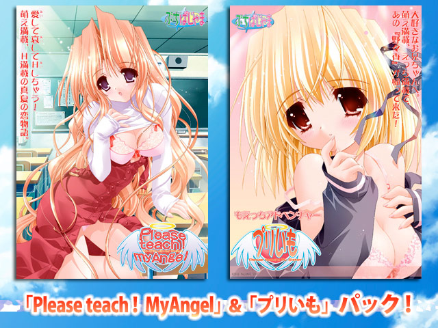 魅惑の爆乳を持つ優しき女教師&天使の‘聖玲奈’と、甘あまでラブラブエッチな同居生活を楽しむ「Please teach! MyAngel」。妹属性を持つお兄さんたちを狂喜乱舞させた‘野々香’をヒロインに、糖度の高いラブ&エッチストーリーを楽しむ「プリいも」。この2作品がお得なパックで販売開始!<2作品共通ストーリ梅雨も終わりを告げたばかりの初夏のある日。主人公‘蒼乃翼’は、近所の公園で空から降臨してくる天使を目撃する。驚くことに彼女は、翼の学校の新任教師‘天川聖玲奈’だった。天界での教師を目指す聖玲奈は、教育実習のために翼の学園に赴任してきたのだ。天使であることを人間に悟られてはならない…もし知られてしまった場合には、教員試験の即時不合格が言い渡される。天界の教師を夢見る聖玲奈は口封じと監視を名目に、翼の家に同居することを提案。半ば強引に住み着くことに……。優しいけれど、ちょっぴり天然でドジな天使‘聖玲奈’。素直で可愛らしい妹‘野々香’。そんなふたりと始まった慌ただしい同居生活。決して忘れることのない夏が今ここに始まった。