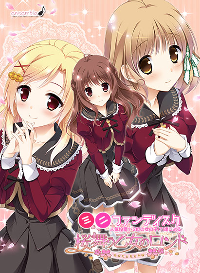 人気投票上位2キャラによる選抜ミニFD!本編後のお話しを描いた本作は、以下の2の新規書き下ろしストーリーをプレイすることが出来ます。■キャラクター人気投票1位『桜さんのぺろぺろはじめ!?』ひさしぶりに日本でお正月を迎える葵。和服姿の桜とデートを楽しむ葵はおせちやお雑煮を久しく食べていないことに気がつく。その時桜が「お雑煮、作りましょうか」と提案してくれる。二人は誰もいない桜花寮でお雑煮を食べる。そして、葵の部屋に入ると桜が葵の耳をぺろぺろしはじめる……。■キャラクター人気投票2位『葵と祐里のナイショの関係』桜花祭のドタバタから時は流れ、葵と祐里は3年生に。思いを告げ葵と恋人になった祐里。しかし、二人の関係は誰にも知られてはいけなかった。しかし、二人の微妙な変化に気がついた人物がいた。そして、葵と祐里に届くとある荷物。 中をあけるとそこにはウェデングブーケが入っていた。 「桜舞う乙女のロンド」本編はこちら☆