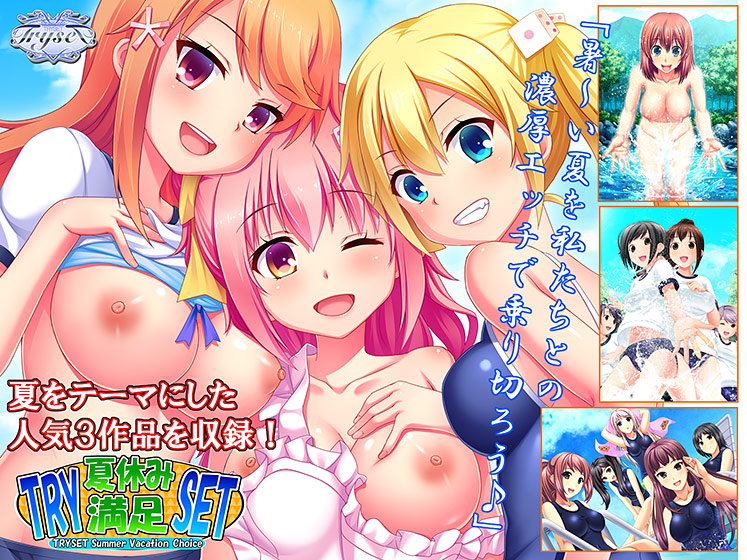 TRYSETの【夏】を題材にした作品の中から、人気作品3本を収録。「TRY夏休み満足SET」を、お買い得なプライスにてご提供です。ママー☆きゃんぷ(ぷらす)、サマー☆すいむ、サマー☆きゃんぷのヒロイン総勢18人。全作品、明るくお気楽にエッチが楽しめる作品です。貞操観念皆無の、ヒロインたちが繰り広げる物語は、乱交必至です。熱い夏のお共に「TRY夏休み満足SET」を!!そしてTRYSETの次回作「僕らのヒミツ基地大作戦」の未公開オリジナルイラストも、先行で同梱ですのでこちらも要チェックです!!「ママー★きゃんぷ ぷらす」優しい義母の優子さんと、一緒に参加することになった一週間のとあるキャンプ。キャンプの趣旨は「親子のコミュニケーション不足の解消」というものだった。個性豊かに参加者に交じり、引っ込み思案な主人公の祥一クンはどう過ごすのか?また、キャンプで待ち受ける、ありえないイベントの数々を無事に乗り越えることはできるのか?「ママー☆きゃんぷ」開幕です!「サマー☆きゃんぷ」親元を離れて大自然の中、行われるキャンプ。みんなで協力しながら食事を作ったり、イベントを行ったり、協調性を養う教育の一環。しかし、引率の先生から思いもよらぬ一言が!?「男女ペアになってセックスを始めてください」あまりに突然過ぎて、その場で茫然とする主人公の良樹クンに、一人の女の子が優しく声をかけてくる。「サマー☆きゃんぷ」無事に終えることはできるのでしょうか?「サマー☆すいむっ!〜私たちどんな恥ずかしい練習にも堪えてみせます〜」部員不足の蘭香学園水泳部。一か月後の全国大会で、結果を出さなければ即廃部という大ピンチ。そんな状況を打破すべく、かつての名選手がコーチとしてやって来るが、エッチな練習法ばかりを考案。それもそのはず、コーチは真っ赤な偽物だった。そのことを知った主人公は口止め変わりに「美味しい恩恵?」を受ける?受けない?果たして、水泳部の運命は?「私たち、どんな淫らな練習にも…絶対に耐えてみせます〜」単品でお楽しみたい方はコチラ♪ 『ママー★きゃんぷ ぷらす』 『サマー☆きゃんぷ Windows8対応版』 『サマー☆すいむっ!〜私たちどんな恥ずかしい練習にも堪えてみせます〜 DL版 Windows8対応版』
