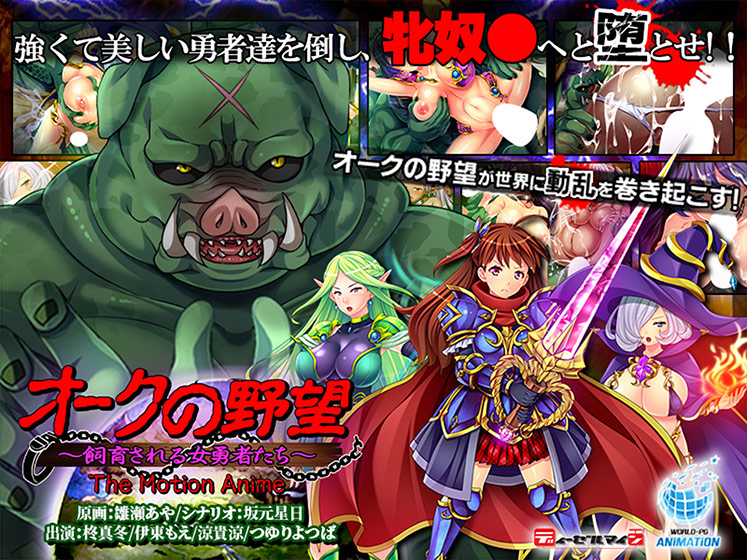 同人サークル「ディーゼルマイン」PCゲーム「オークの野望〜飼育される女勇者たち〜」がモーションアニメ化!!■あらすじ――勇者によって魔王が倒された。それと同時にオークもほとんどの同胞を失い、絶滅の危機に陥る。しかし「魔王の核」を食べて進化した主人公は人間の村を襲って女たちを捕まえ、牝○へと堕とすことに成功。繁殖の為に牝牧場を作り上げて、女達に子孫を産ませより強いオークの軍団によって勢力を拡大させていく……主人公は勇者を倒して、オークの王国を作り上げる事が出来るか。それとも唯のモンスターとして狩られてしまうのか。雑魚モンスターであったオークの野望が世界に動乱を巻き起こす!